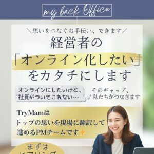 株式会社TryMam(トライマム) TryMam BPOオンラインスタッフサービス (株式会社TryMam) 企業の業務効率化と固定費削減を目的としたオンラインスタッフサービスです。 MISSION SHIFT(プロフェッショナル) INVISIBLE HQ(雇わずに本部) PEAK SHIELD(忙しい時だけ増員) 雇わずに、運用……